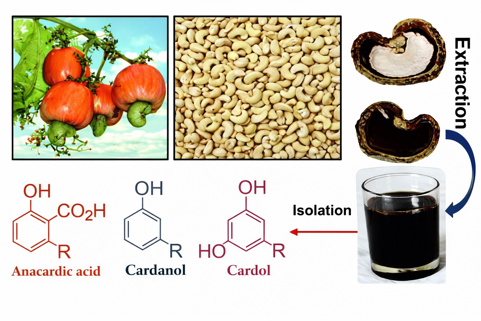 Cashew Nut Shell Liquid (CNSL) is extracted from cashew shell by-products and contains phenolic compounds such as cardanol, cardol, and anacardic acid, which can be chemically transformed into valuable industrial materials, providing a sustainable alternative to petroleum-based raw materials while supporting waste reduction and greener industrial production.